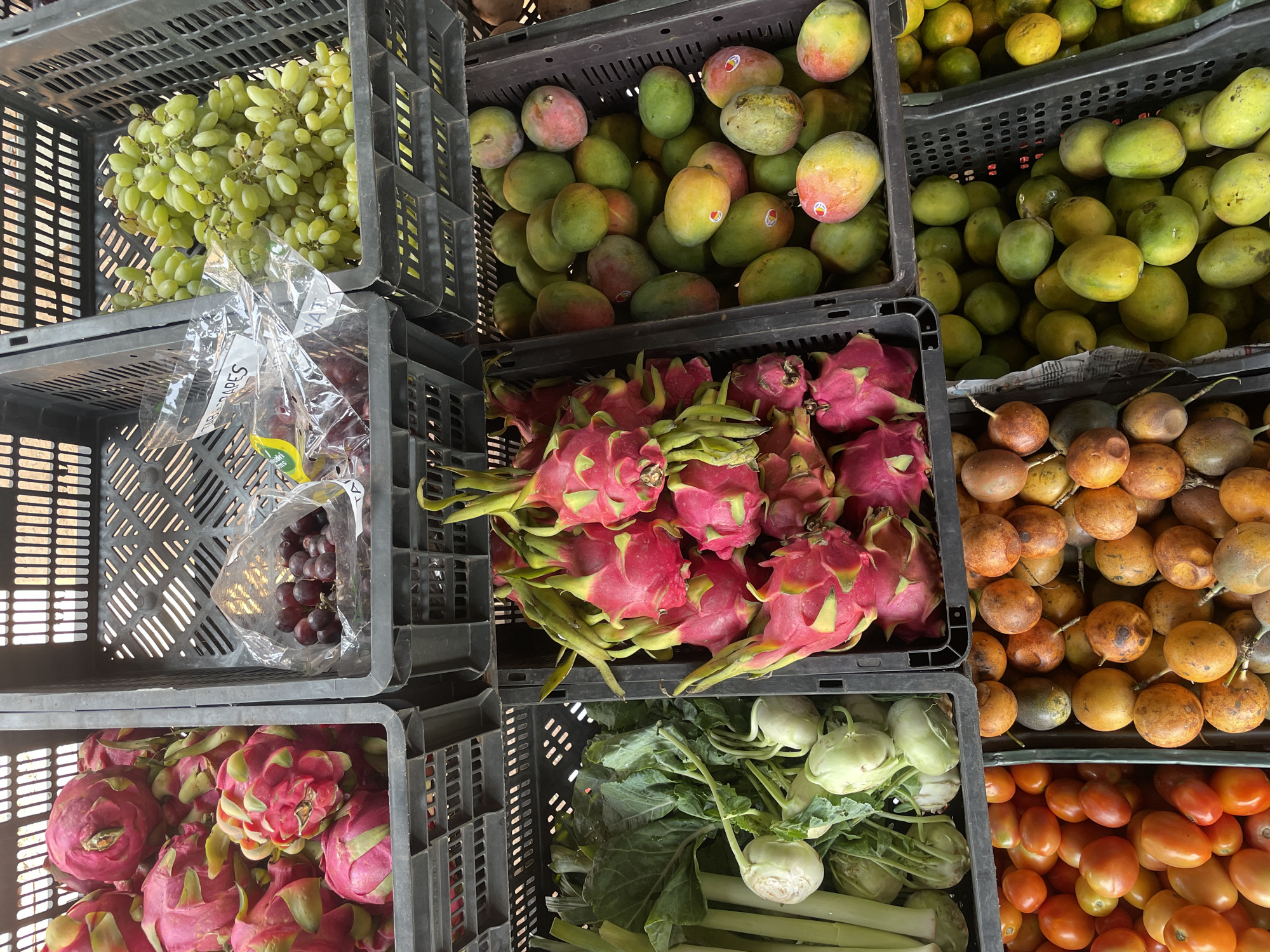 display of fruits and vegetables in what appears to be a market setting. The items are arranged in black plastic crates. From left to right and top to bottom, the crates contain: green grapes, mangoes, small yellow mangoes, red grapes in a plastic bag, dragon fruits, passion fruits, dragon fruits, kohlrabi with leaves, and tomatoes. The photo was taken in Oxel, India. No people are visible.