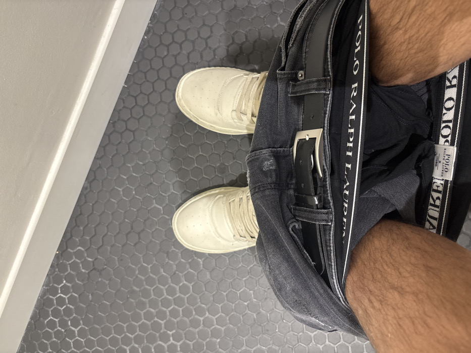 A person's-eye-view shows open jeans with a black belt, revealing Polo Ralph Lauren underwear. Below, feet wearing light-colored sneakers stand on a hexagonal tiled floor, adjacent to a white wall. The floor is grey. Skin tone is warm.