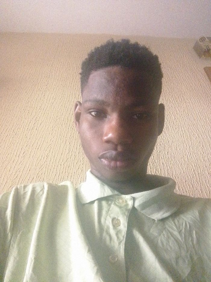 A close-up, head-and-shoulders portrait of a young male subject with dark skin and short, dark, curly hair is depicted
