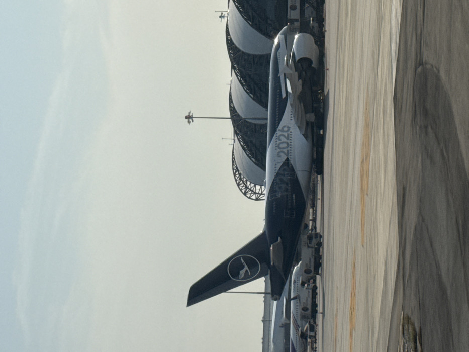 The scene depicts an outdoor airport tarmac at Suvarnabhumi Airport, Thailand, located within the broader region encompassing Nong Prue Subdistrict. A large Lufthansa Airbus A380 passenger aircraft is centrally parked, featuring a dark blue/black upper fuselage and tail, transitioning to white on the lower fuselage. The tail displays the white Lufthansa crane logo. The fuselage exhibits '2026' prominently in white, with '1926' partially visible towards the front. An engine is visible on the starboard wing. To the left, tails and fuselages of smaller aircraft are visible, accompanied by airport ground support vehicles. In the background, a distinctive terminal building with a wave-like arched roof structure is present, along with a tall light mast topped with a red warning light. The ground is a concrete tarmac with faded yellow markings. The sky is clear and light blue, indicating daytime conditions. No human figures are discernible.