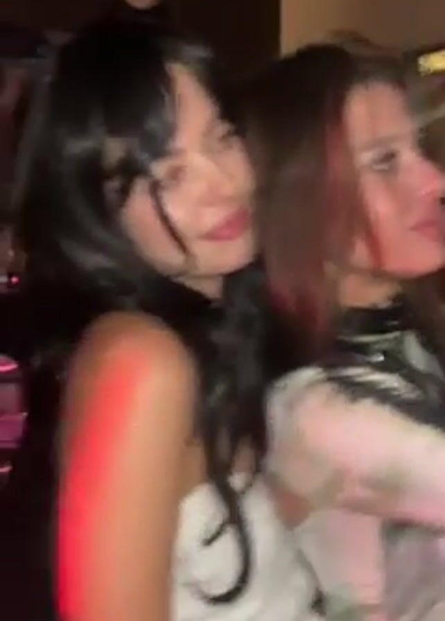Two women are seen from the chest up, shoulder-to-shoulder, smiling and dancing in a dim, crowded bar, likely at night. The woman on the left has dark hair, bangs, a white top, and a choker. The woman on the right has long brown hair and is wearing a long-sleeved shirt with a black choker and black harness-style straps. Red and pink light is shining on the scene. Other people are visible in the background.