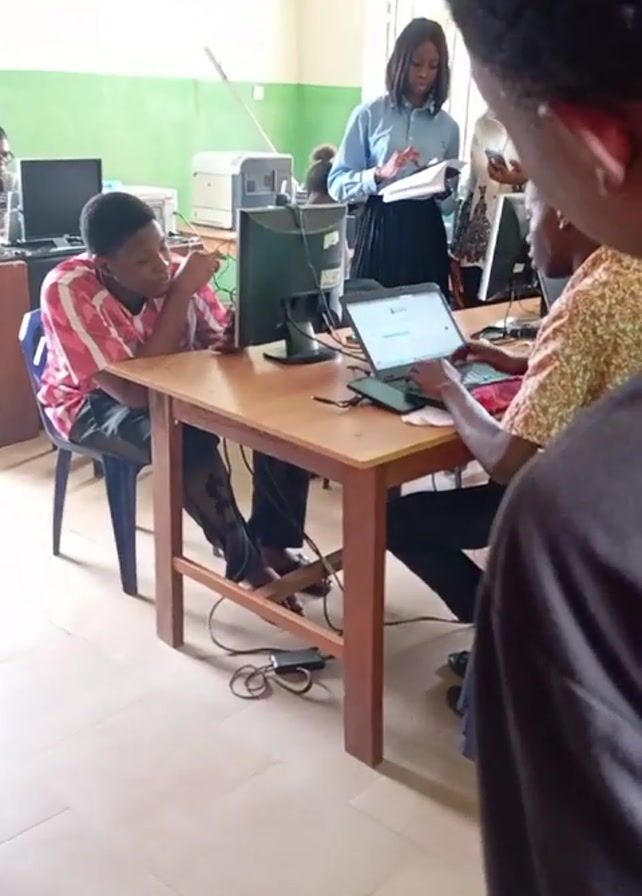 The scene depicts an indoor setting, likely a classroom or computer lab, as suggested by the presence of computers and tables