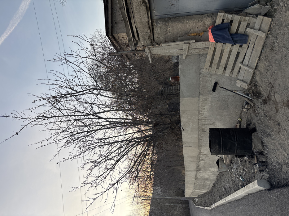 The image depicts a roadside scene in Vaghatin, Armenia, under a late afternoon or early evening sky with a visible aircraft contrail. A narrow asphalt road curves to the left in the foreground, bordered by a concrete curb. Adjacent to the curb is a dirt and gravel verge, where a blackened metal barrel, possibly used as a burn barrel, rests on bricks. Nearby, a shovel with a black handle leans against a grey concrete retaining wall that extends horizontally across the midground. Various debris, including plastic items, are scattered on the ground around the barrel. To the right, a wooden pallet is propped against a dilapidated concrete structure with a grey metal door; a blue garment with orange lining is draped over the pallet. Behind the retaining wall, bare deciduous trees and shrubs are prominent, with a large, leafless tree dominating the center of the frame. Utility wires traverse the upper sky. On top of the concrete wall, behind the central tree, a large glass jar containing an amber liquid is visible. No individuals are present in the scene.