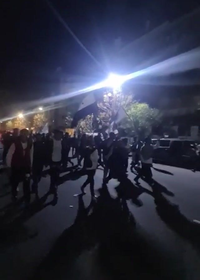 A group of people are walking on a paved road at night, illuminated by a street light. Some individuals are holding flags. The overall visibility is low due to the darkness. There appear to be parked cars on the side of the road. The people are casting long shadows.