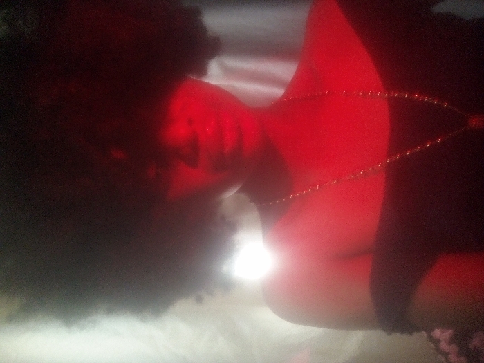 An indoor portrait photograph, taken in Badore, Nigeria, depicts an individual, likely female, positioned centrally and facing the camera directly. The subject possesses dark, voluminous afro-style hair that extends to obscure the upper portion of the face, including the eyes. The visible lower facial features, comprising the nose, mouth, and chin, along with the neck and upper chest, are bathed in a prominent red light. The individual wears a dark, off-the-shoulder garment. A single, long, thin, gold-colored chain necklace with a small pendant rests on the chest. A strong, diffused white light source is visible in the background to the subject's left, creating a luminous halo effect on that side of the hair and shoulder. The background beyond the subject is indistinct and out of focus, suggesting an interior setting.