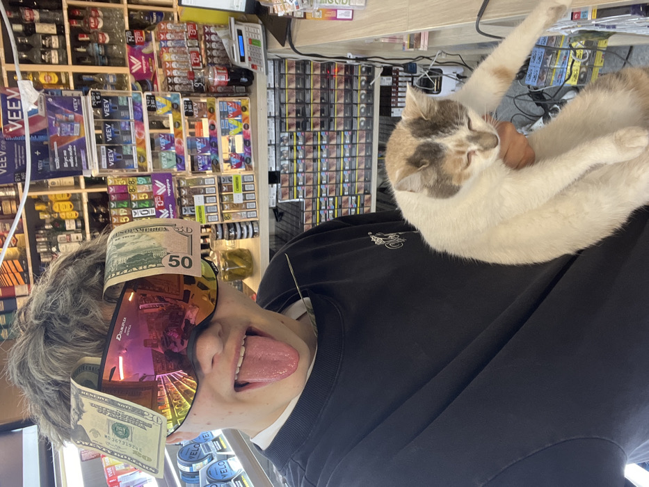 A person with light-colored hair is centered in an indoor retail establishment located in Silistra, Bulgaria. The individual wears a black long-sleeved shirt featuring a small white logo on the left chest. Oversized ski-style goggles with reflective orange-pink lenses, marked "DOUBLEFLEX OPTICA," are worn, with a $20 US dollar bill tucked into the left top frame and a $50 US dollar bill into the right top frame, resting on their forehead. The person's mouth is open, with the tongue fully extended. Held in the person's right hand is a cat, primarily white with light brown and dark grey patches on its head and back, its eyes appearing as slits. The background consists of a well-stocked store. Shelves to the left display cylindrical containers, possibly nicotine pouches (e.g., "VELO"). A countertop runs across the mid-ground, featuring a cash register, a red cup of Coca-Cola, and jars of pickled items. Behind the counter, extensive shelving holds rows of cigarette packs at lower levels, and multiple displays of vape products ("VEEV," "VAPORPRO"), along with numerous bottles of alcoholic beverages on higher shelves. Cyrillic text is visible on some product displays.