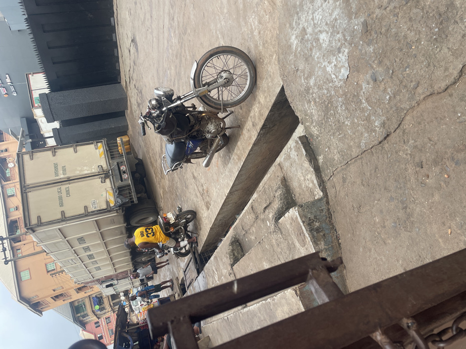 The scene captures an elevated view of a bustling street. Two parked motorcycles stand out, one near a large truck with faded white paint. A person in a yellow jersey sits astride another motorcycle amidst a gathering of people. The perspective is slightly tilted, revealing a concrete structure with steps and a metal railing in the foreground, adding depth to the urban landscape.