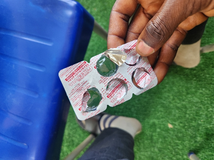 A close-up photograph displays a dark-skinned human hand holding a white blister pack of "Mentholyptus EXTRA STRONG" lozenges
