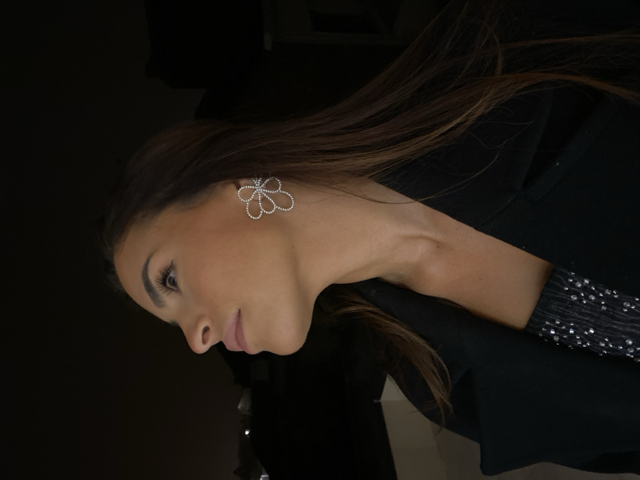 A woman with brown hair poses sideways against a dark background. She wears a black blazer over a top with silver embellishments on the sleeves. Her skin is fair, and she has pronounced cheekbones and a slender neck. A large, floral-shaped earring made of small, bright dots is visible on her left ear. The image is well-lit, highlighting her face and jewelry.