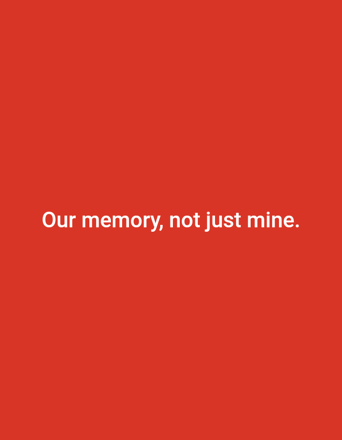 - "The image is a solid red background with the text "Our memory, not just mine" by FM-Orxuv2, licensed under CC BY 4.0