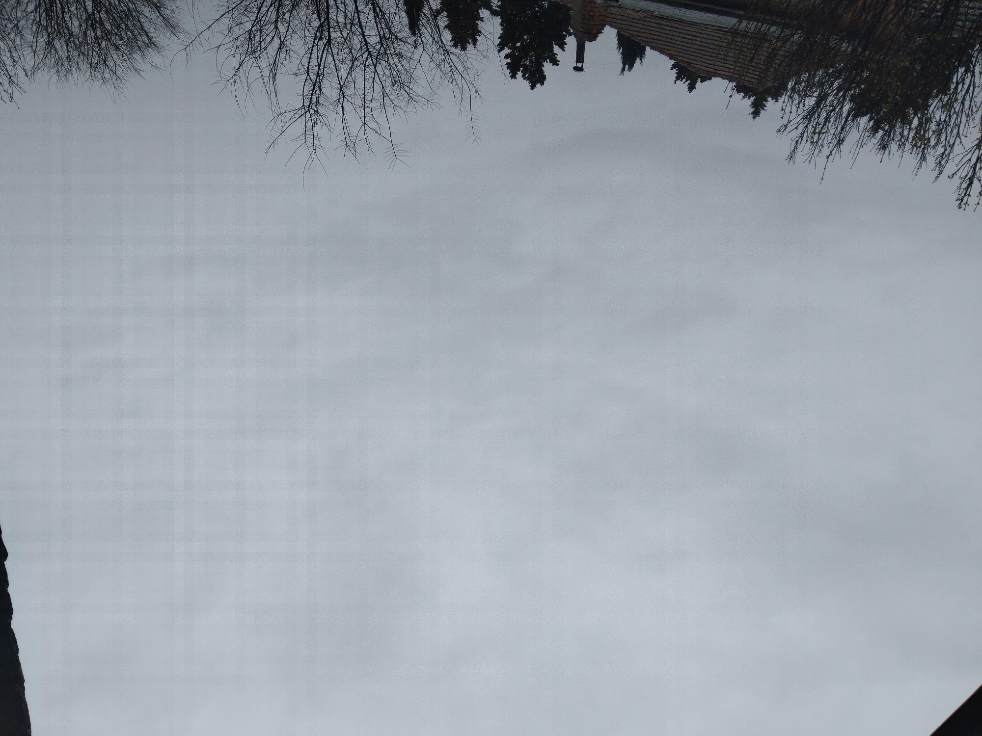The image is an upside-down view of a cloudy sky in Kameno, Bulgaria. Bare tree branches are visible in the top portion of the image, as well as the roof of a building with a chimney. The lower portion of the image is predominantly grey sky. An indiscernible black object is partially visible at the bottom left corner. The sky is overcast.