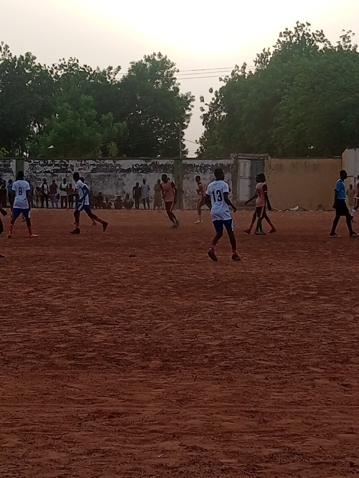 soccer game being played on a dirt field in Birnin Kebbi, Nigeria, located at latitude 12