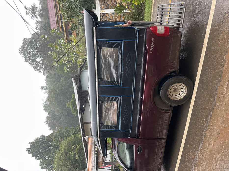 The scene depicts a maroon Isuzu D-MAX pickup truck parked on a wet asphalt road in Ban Paem Bok, Thailand, under a steady rainfall. The truck's bed is equipped with a custom black canopy featuring three clear plastic windows on its visible side, outlined with blue trim. The lower body of the truck appears splattered with mud or dirt. A metal, grid-like ramp or step is lowered from the rear tailgate of the vehicle. A person's arm and a portion of their upper torso, clad in a light-colored shirt, are visible holding onto the internal frame of the canopy on the passenger side. The road surface is visibly wet with reflections, and a solid white line runs parallel to the truck. In the background, dense green foliage covers hillsides under an overcast sky. Several buildings are visible, including one with an ornate, multi-tiered orange roof (possibly a temple) nestled among the trees on an elevated terrain, and another with a simpler, light-colored roof lower down. Utility lines cross the upper portion of the frame. A stone wall with decorative elements is partially visible to the right of the truck. A sign with Thai script and a Thai flag are partially visible to the left.