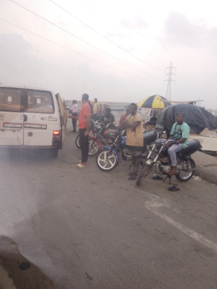 A congested scene features a white "Nigeria Army" van with its door open. Several men gather near a row of parked motorcycles. One man in an orange shirt stands beside the van, while others are around the bikes. A man in a light green shirt sits on one of the motorcycles. A yellow and black striped umbrella is in the background, near what appears to be a market area. A powerline tower is visible in the distance under a cloudy sky.