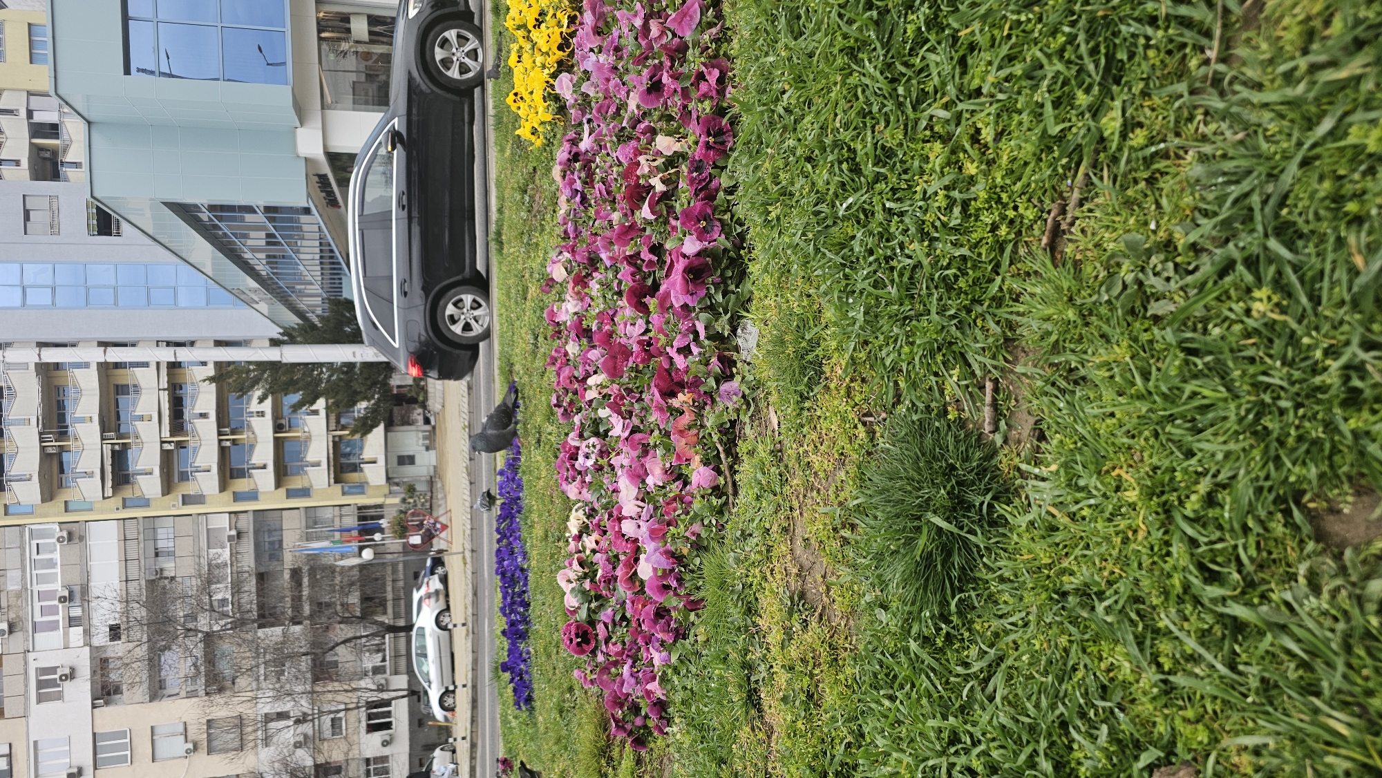 The image displays an urban street scene in Plovdiv, Bulgaria, captured from a low perspective on a grassy median strip. In the foreground, green grass covers the ground, featuring three distinct clusters of pansies: a patch of purple pansies, a larger bed of mixed pink and dark purple pansies, and a smaller section of yellow pansies. Several common pigeons are present on the grass adjacent to the flowerbeds, with one prominent dark grey pigeon positioned near the purple pansies. The midground features a paved road with a black Mercedes-Benz GLC SUV traveling from left to right. In the background, under an overcast sky, a multi-story urban landscape is visible. To the left, a series of older residential buildings with numerous balconies and air conditioning units line the street, accompanied by several bare deciduous trees. To the right, a modern commercial or office building with a distinctive light blue paneled facade and extensive blue-tinted glass windows is prominent. A flagpole situated between the residential buildings and the road displays the national flag of Bulgaria and another flag, likely that of the European Union. No human subjects are visible.