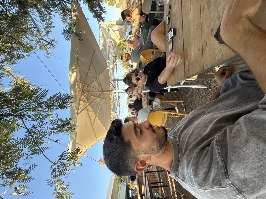 The image depicts an outdoor social gathering area in Lapid, Israel, under a clear blue sky, partially shaded by large, light-colored patio umbrellas and tree foliage. In the immediate foreground, a young adult male with dark hair, a trimmed beard, and mustache, wearing a grey, distressed-look long-sleeved shirt, is seated at a wooden table, looking towards the right with a slight smile. In the midground, to the right, another young adult male with dark, curly hair and dark round sunglasses, wearing a black shirt, is seated at a similar wooden table, leaning back with his right arm resting on the table while holding a small, indistinct object. On his table, a smartphone and a small black credit card payment terminal are visible. Several other individuals are seated at additional wooden tables in the background, some on bright yellow plastic chairs and others on white chairs, engaged in conversation or repose. Visible background elements include a wire fence, green vegetation, a partial view of a white vehicle, and string lights suspended overhead. The ground surface appears to be gravel or dirt.