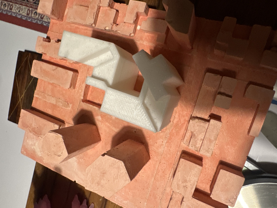 A miniature architectural model is displayed, featuring a textured, coral-colored base with raised block-like structures representing buildings or features