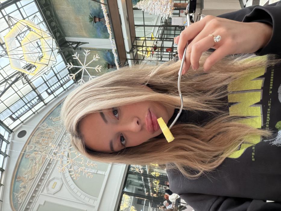An indoor photograph captures a fair-skinned female, approximately 20-35 years old, with long blonde hair, looking directly at the camera. She is wearing a dark, possibly charcoal grey, long-sleeved hooded sweatshirt with a lime green graphic design on the front. Her right hand, bearing a gold-toned ring with a prominent oval-cut clear stone on the ring finger, holds a silver-colored fork. A rectangular piece of yellow fruit, resembling mango or pineapple, is impaled on the fork, positioned near her glossy lips. The background reveals the ornate interior of the Winter Garden at the Sofitel Legend The Grand Amsterdam, Netherlands. Overhead, a multi-paneled glass roof is visible. White arched architectural elements and classical murals depicting figures and crests adorn the upper walls. Several illuminated white snowflake decorations are suspended from the ceiling. A large, geometric, light-colored chandelier hangs from the ceiling on the right side, where a small, white, illuminated Christmas tree decoration is also present on a counter. Blurred figures of other individuals are seated in the distant background.