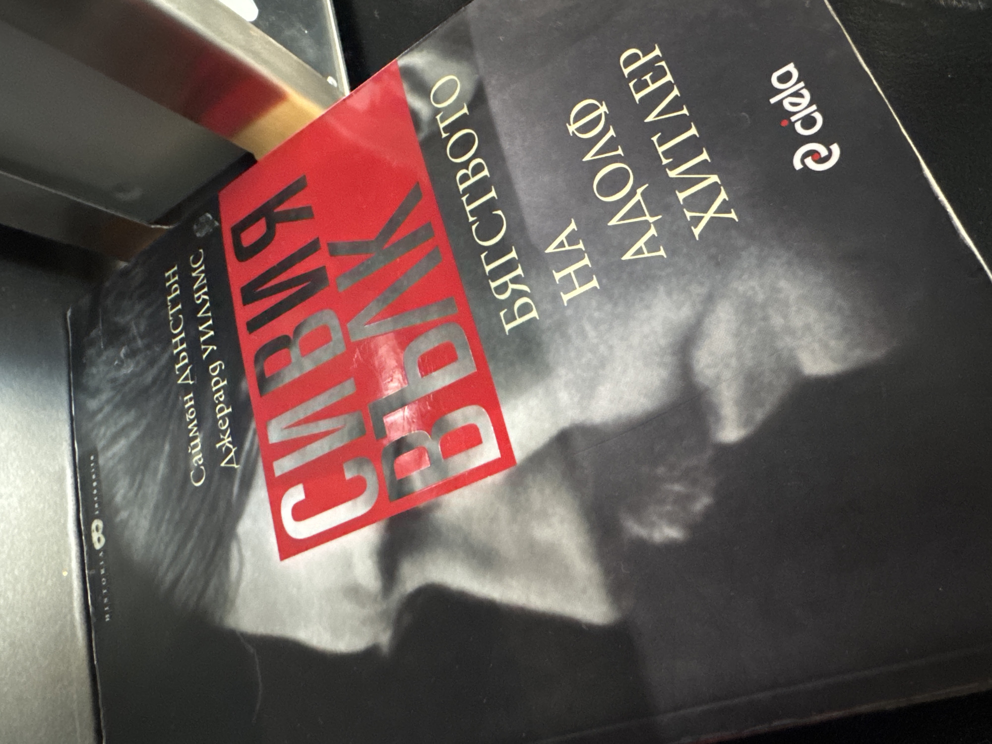 book lying on a dark surface. The book cover is mostly black with a grayscale image of a person's face. Large red letters that are in Cyrillic overlap the image. To the right of the face, there is more Cyrillic text and a logo that says "ciela" under a stylized graphic. On the spine of the book, there is Cyrillic text and a logo that includes the word "HISTORIA". The top of the book is partially obscured by a metallic object. The image does not contain any information about the location of Kameno, Bulgaria.