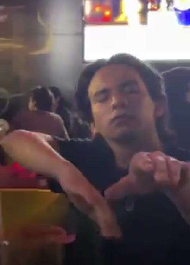 . The video shows a person dancing in a dimly lit bar. The person is wearing a black t-shirt and has dark hair. They are making various hand gestures while looking at the camera. There are other people in the background, and a large screen displaying colorful graphics. A drink is visible on the bar counter. The overall atmosphere appears lively and energetic.