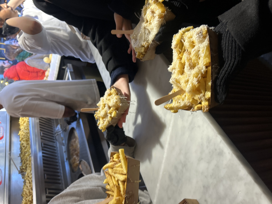 In a food stall in Amsterdam, Netherlands, multiple individuals are observed holding prepared french fries