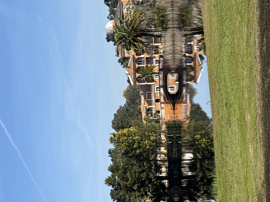 The image depicts a tranquil waterscape in Mira, Portugal, featuring a large, multi-story building complex with terracotta-colored roofs and facades. The complex, possibly a resort or residential property, incorporates arches and multiple windows, with one section topped by a silver-domed roof. An arched bridge, matching the architectural style and color of the buildings, spans a narrow waterway, connecting parts of the complex. The buildings, bridge, and surrounding dense vegetation, which includes palm trees and other deciduous and evergreen trees, are clearly reflected on the calm water surface. The foreground consists of a gently sloped patch of green grass, partially obscuring the immediate shoreline. The background features a clear, light blue sky with a single white contrail visible towards the upper left. No people or specific actions are visible within the frame.