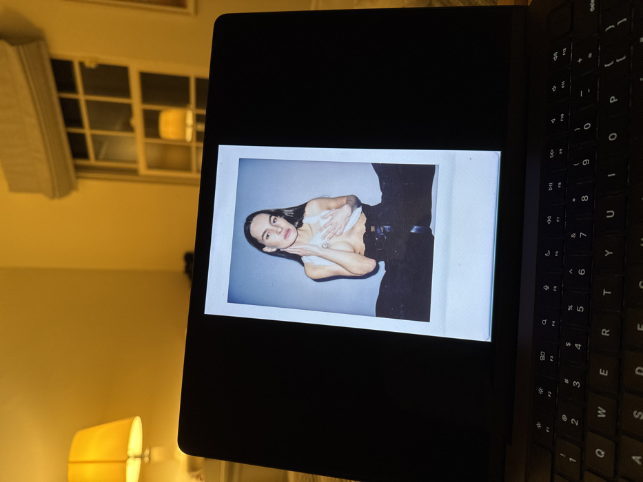 A laptop displays a Polaroid-style photo of a woman with long dark hair, posing with her hands covering her chest, wearing a dark outfit with a belt