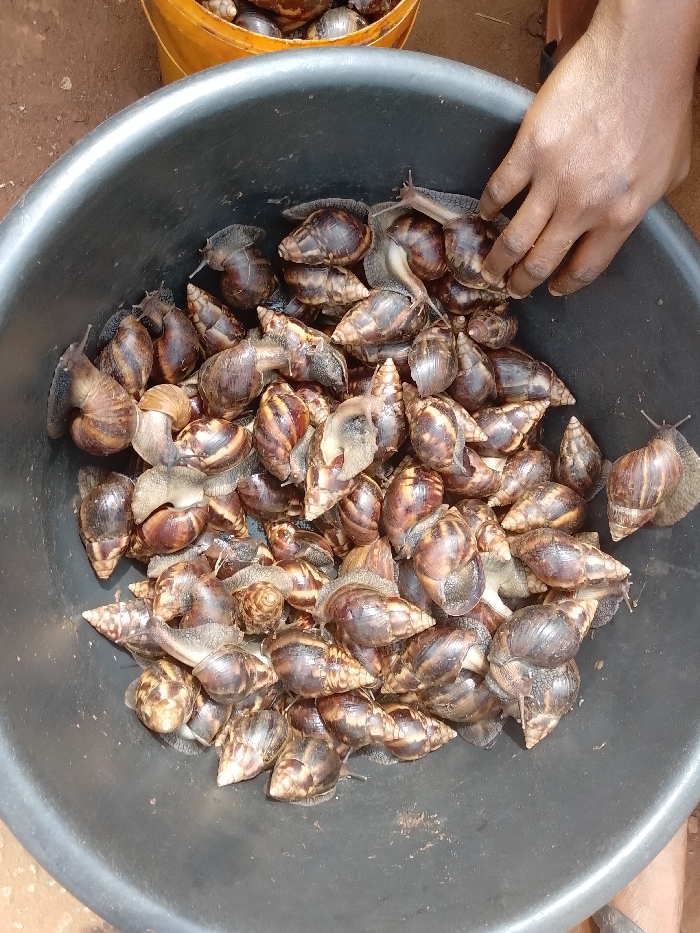 - "The image depicts a close-up, high-angle view of numerous live giant African land snails (likely Achatina achatina or Achatina fulica) contained within a large, round, black plastic basin" by FM-TKrYD3, licensed under CC BY 4.0