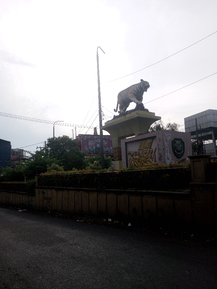- "The image displays a street scene in San Pya, Myanmar, dominated by a large tiger statue positioned atop a light-colored, elevated pedestal to the right of the frame's center" by FM-1M4q23, licensed under CC BY 4.0
