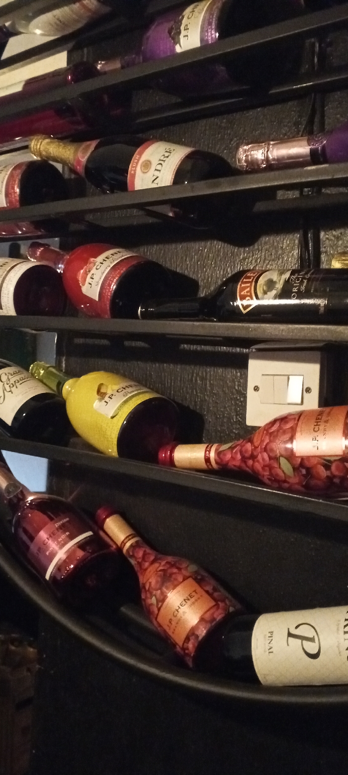 - "This image presents a detailed view of multiple bottles of alcoholic beverages, predominantly wine and sparkling wine, stored horizontally on dark metal shelves against a dark, textured wall" by FM-40Lrj2, licensed under CC BY 4.0
