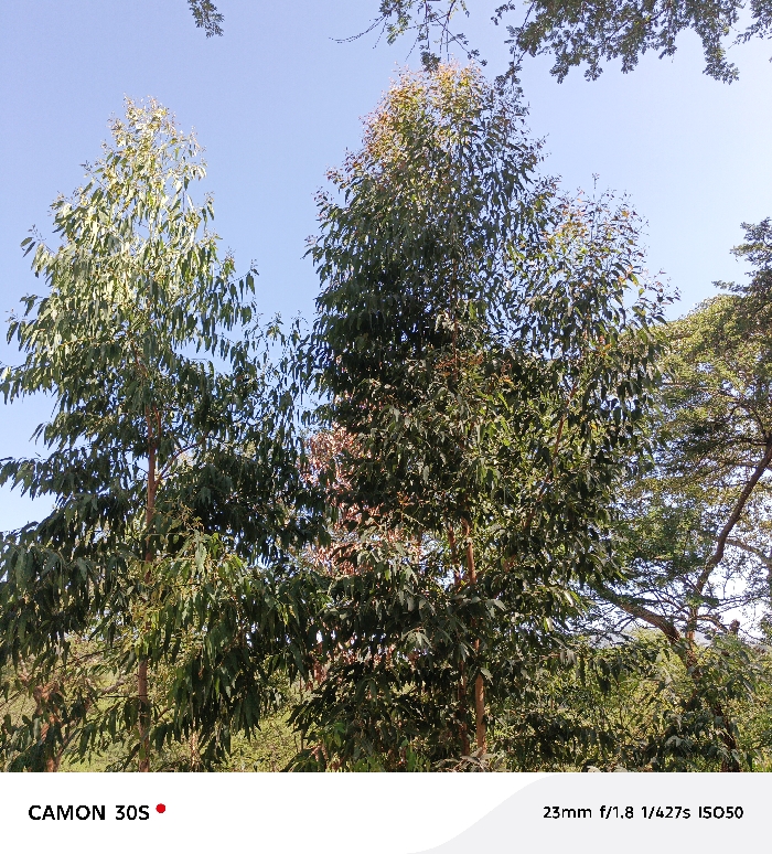 The scene depicts an outdoor environment in Kasunguni, Kenya, dominated by vegetation under a clear, light blue sky. Two prominent, tall, slender trees with dense, elongated green leaves occupy the central and left portions of the frame, extending upwards. Their visible trunks are reddish-brown. The tree on the right is slightly taller than the one on the left. Scattered lighter green and reddish-brown foliage is visible at the very tops of the trees and interspersed within their canopies. Additional green foliage from other trees is present in the background, particularly on the right side of the image, contributing to a dense arboreal environment at the lower and middle levels. The scene is brightly illuminated by natural light, indicating daytime conditions. There are no individuals, structures, or discernible actions present.