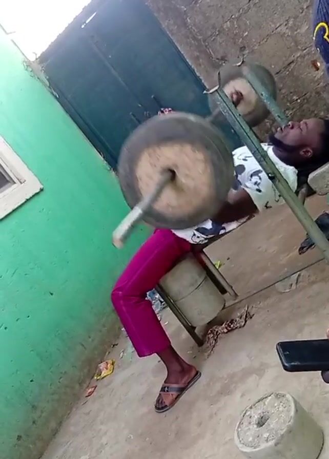 A man is shown in profile squatting with a heavy barbell in an outdoor area. The barbell has two wheels attached, presumably for weight. The man is wearing pink pants and sandals. He is lying on a makeshift bench in a narrow space with a green wall to his left. Someone is filming him with a phone. A cement block is on the ground in the foreground. In the background is a weathered door and the top corner of an adjacent building.