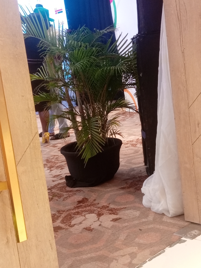 A potted palm with slender, green fronds rests in a black planter on a carpet with a neutral, repeating pattern. Part of a door frame with a gold accent is visible on the left. In the background, indistinct figures stand near draped fabric and a display with flags. A tall, dark structure is situated next to white, flowing fabric on the right. A single yellow high heel is visible in the periphery.