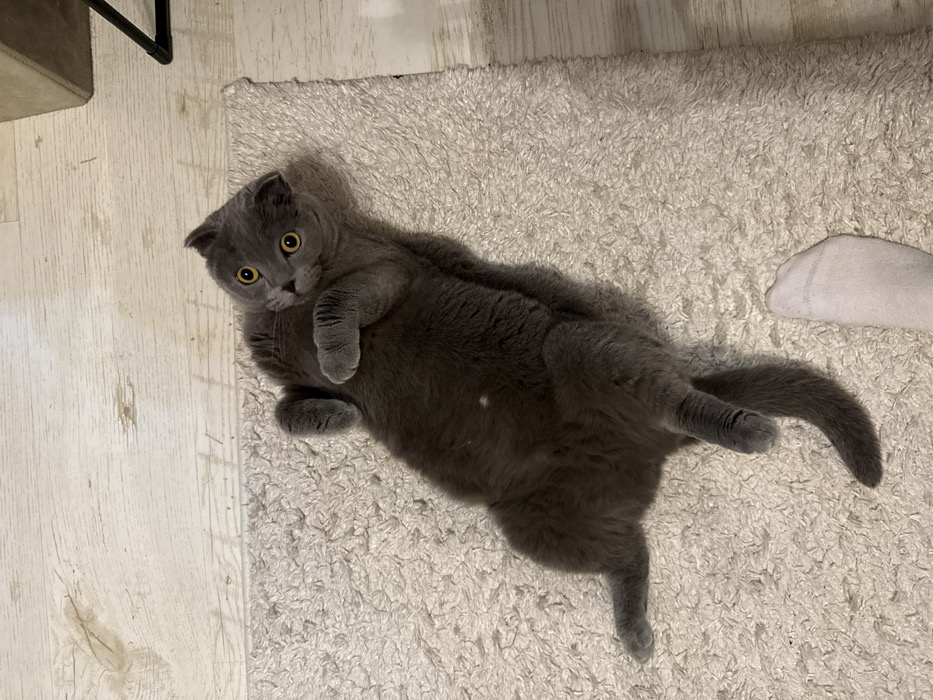 A grey Scottish Fold cat is observed lying supine on a light cream-colored shag rug