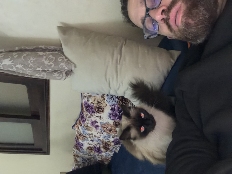 - "A man wearing glasses reclines with a fluffy Siamese cat" by FM-vA9lX2, licensed under CC BY 4.0