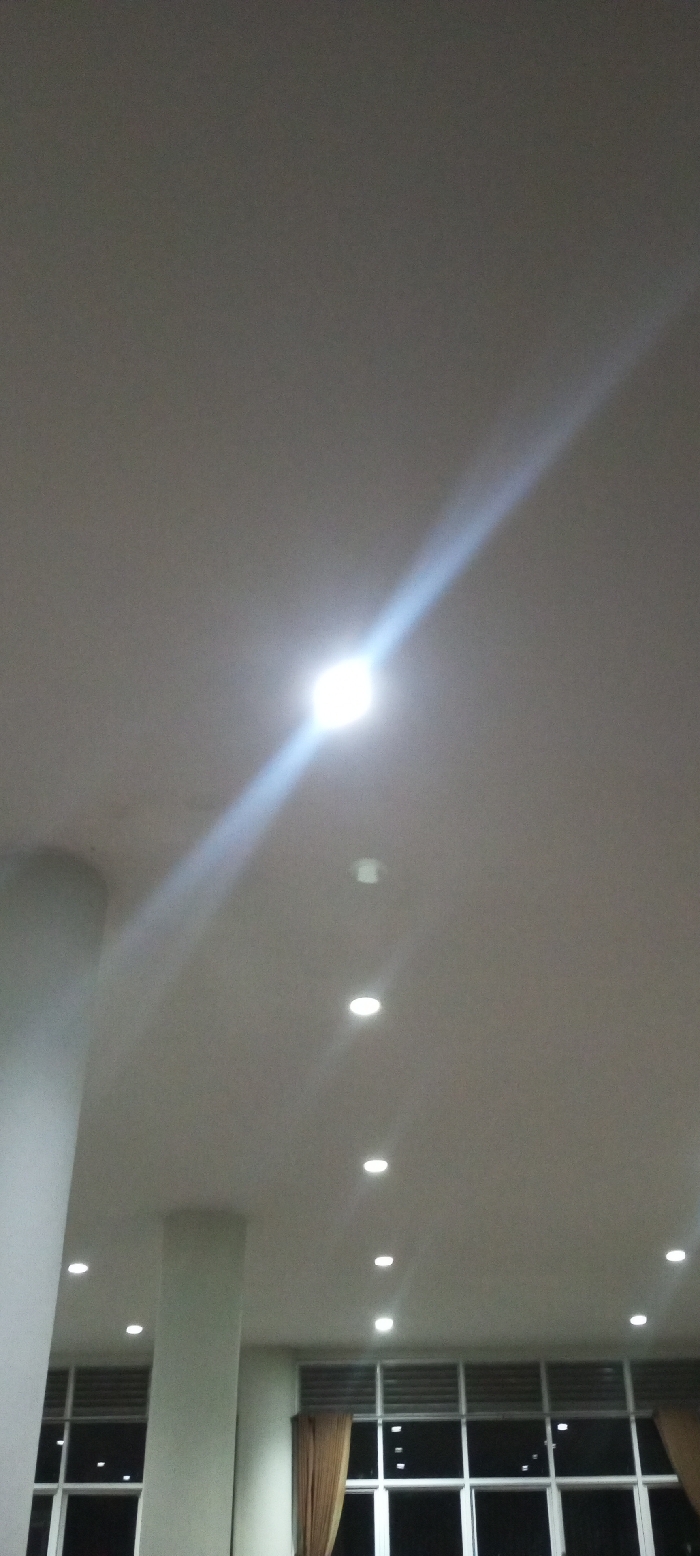 This image captures an interior scene, located in the city of Aral, Kyrgyzstan, looking upwards towards a ceiling and a large window bank at night. The ceiling is light-colored, featuring multiple recessed circular light fixtures, approximately ten of which are illuminated. A prominent light fixture in the upper-center is highly overexposed, creating a significant bright glare and a diagonal lens flare spanning across the upper half of the frame. Two light-colored, broad support columns are partially visible on the left side of the frame, extending upwards towards the ceiling. In the lower portion of the image, a wide horizontal section of windows is visible, divided by light-colored mullions into a grid pattern. The exterior visible through the windows is dark, consistent with nighttime, and shows several small, indistinct lights in the distance. Brown or tan curtains are partially drawn over the window sections on the right. No individuals, discernible subjects, or specific actions are depicted within the frame.