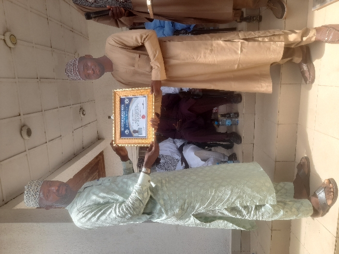 Two men, both wearing traditional clothing and hats, present a framed certificate. The man on the left wears a light green garment and sandals, while the man on the right is dressed in tan clothing with leather shoes. The certificate features a blue design and text within a gold frame. A group of people are seated behind them. The scene takes place inside a building with a tiled floor and ceiling lights.