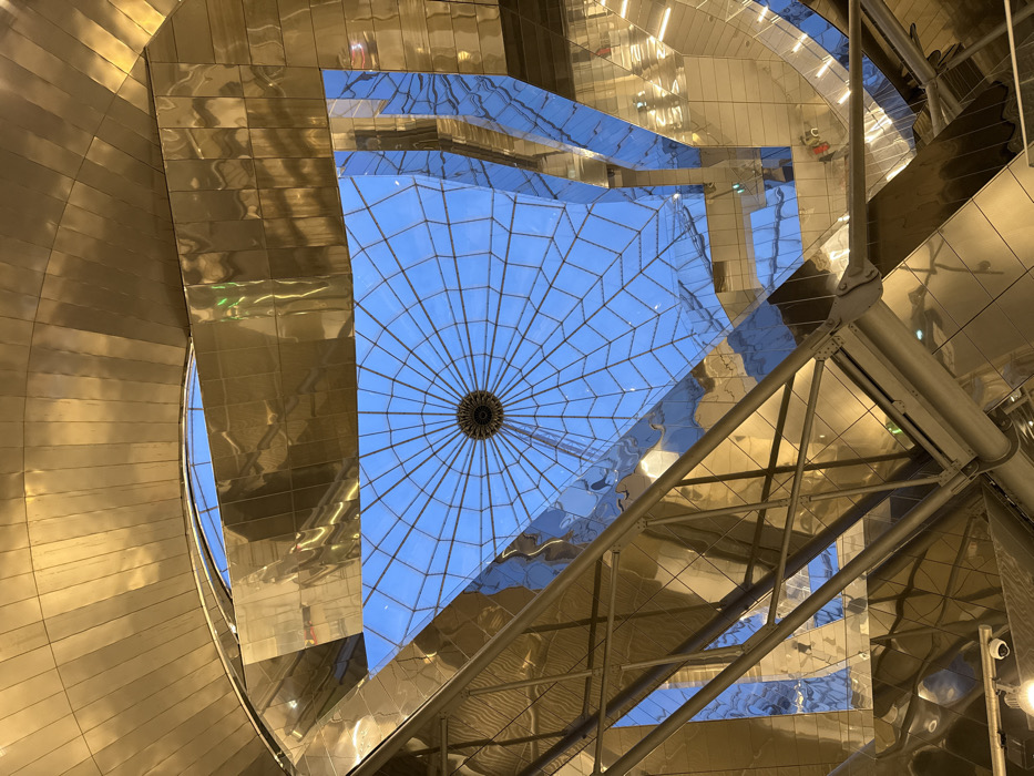 This image captures an upward view into the interior architectural ceiling of the Paul Brousse Hospital in Villejuif, France. The central feature is a large, multi-faceted glass skylight, structured with a radial and geometric grid pattern, revealing a clear blue sky. A dark, circular fixture is positioned at the precise center of this skylight. Surrounding the skylight is a complex, undulating ceiling composed of numerous highly reflective, gold-toned metallic panels. These panels exhibit distorted reflections of the blue sky, internal structural elements, and faint artificial light sources. Diagonal, matte gray metal trusses and support beams are visible in the lower and central-left portions of the frame, providing structural integrity to the ceiling. A white-cased security camera (CCTV) is mounted on a lower structural element in the bottom-left corner, adjacent to a recessed light fixture. No individuals or specific actions are depicted within the scene, focusing solely on the architectural details and the interplay of light and reflection.