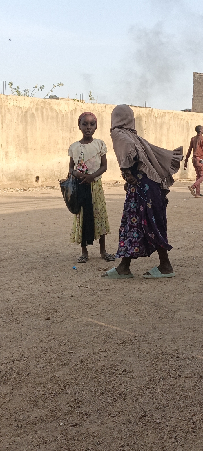 Two girls stand outdoors on a dirt surface. The girl on the left wears a light-colored shirt and a yellow floral skirt, and she holds a black bag. The girl on the right is draped in a brown head covering and wears a patterned skirt, with light blue slides. A person walks away from the pair. A cream-colored building with some plants on top stands in the background.