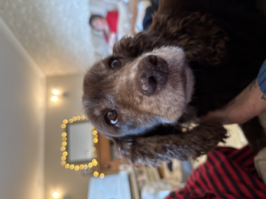 The image captures an indoor domestic scene within a residence in Tideford, United Kingdom. The foreground is dominated by the head and upper body of a dark brown dog, likely an older spaniel breed, characterized by wavy fur, prominent dark eyes, and a muzzle exhibiting significant graying. Its dark, mottled nose is centrally featured. A human hand, displaying tattoos on the forearm and a blue cuff, is positioned beneath the dog's chest area, suggesting physical interaction. A limb clothed in red and black striped fabric is partially visible on the far left. The background, rendered out of focus, reveals a living room. On the right, a person with short, dark hair, wearing a red top, is seated on a light-colored sofa. Centrally, a fireplace mantelpiece is visible, above which hangs a rectangular mirror. Yellow string lights are draped around the mirror, producing blurred circular light effects. Two illuminated wall sconces are present on the wall above the mantelpiece. A large, light-colored object, possibly a television screen, is partially visible on the far left. The room's walls are a light, neutral tone.