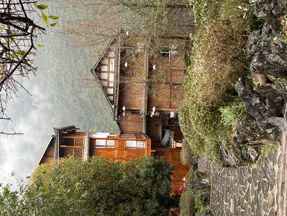 The image depicts a traditional village scene in Gongtan, China, characterized by wooden architecture set against a misty, mountainous backdrop. In the foreground, a wet, irregular stone-paved path ascends from the lower right towards the upper left. Dark, moss-covered rocks and various green and dormant brown bushes line the path. In the midground, two primary multi-story wooden structures are visible. The building on the left is a tall, reddish-brown wooden structure featuring traditional tiered roofs with dark tiles and ornate wooden balconies on its upper levels, equipped with intricate railings. White-framed windows are visible on its side. A large, leafy green tree partially obscures the lower left portion of this building. Behind the tree, near the path, a person wearing a red top is partially visible. To the right, a second wooden building, lighter brown in tone, presents a distinct roofline with white and dark trim. Multiple red-orange lanterns hang from its facade, and a single window is visible on its lower section. A connecting wooden structure or walkway bridges the two buildings at an elevated level. Bare tree branches with minimal foliage frame the upper right of the scene. The background features steep, densely forested mountains, partially obscured by a thick layer of mist or low clouds, indicating a humid or damp atmospheric condition. The overall environment appears serene and traditional, likely captured on an overcast day.