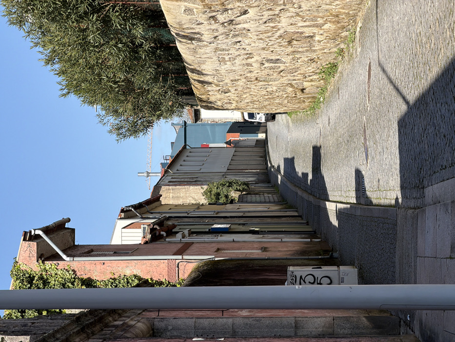 An uphill street view showcases a narrow pathway lined with buildings and a high stone wall on the right. A tall tree and blue sky are visible above. The buildings are a mix of colors and materials, with some covered in ivy. The street has stone steps and shadows, leading to a white vehicle parked further up. A gray pipe and stone barrier are partially visible in the foreground.