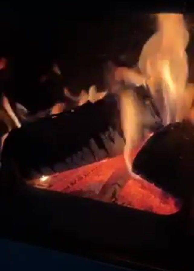 close-up view of a fire burning inside a wood-burning stove or fireplace