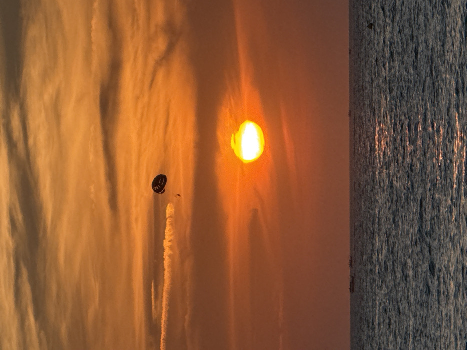 The image captures a sunset over the water at Cenang Beach, Malaysia. The sky is predominantly colored in intense orange and red tones, traversed by streaky horizontal cloud formations. A bright, flattened, yellow-orange sun is positioned low above the horizon, slightly right of the frame's vertical center. In the upper-left quadrant, a dark parasail canopy is visible, with a single dark human figure suspended beneath it, engaged in parasailing. The ocean surface below is a dark blue-grey, exhibiting subtle ripples and reflecting a glimmer of the sunset light. Multiple small, dark boat silhouettes are present on the distant horizon line, concentrated towards the left side of the frame. A single dark, indistinct buoy floats on the water closer to the right foreground.