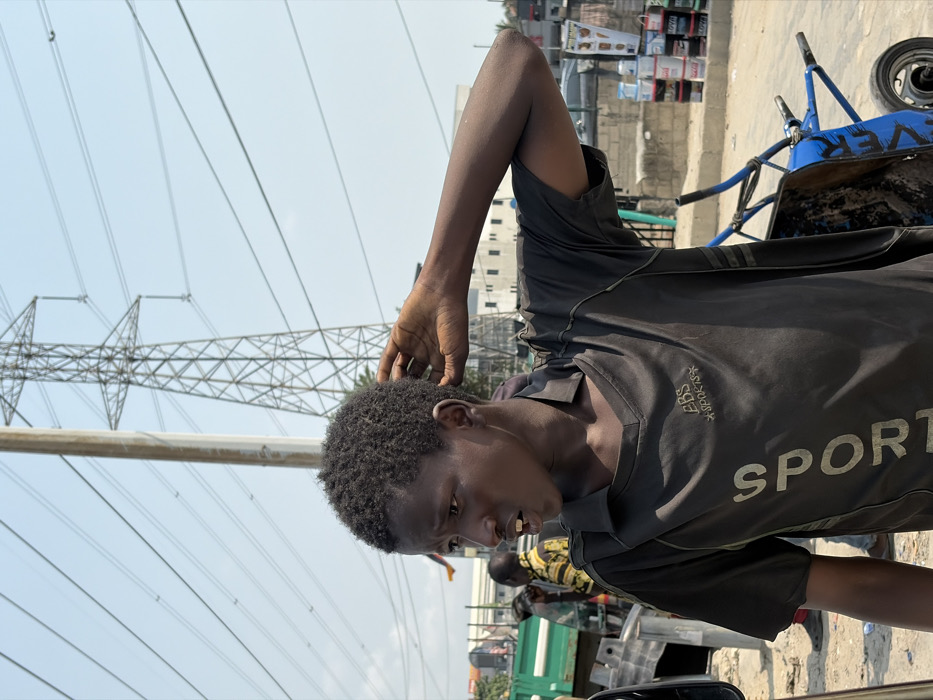 The image depicts an outdoor street scene in Ikota, Nigeria, under a clear, light blue sky