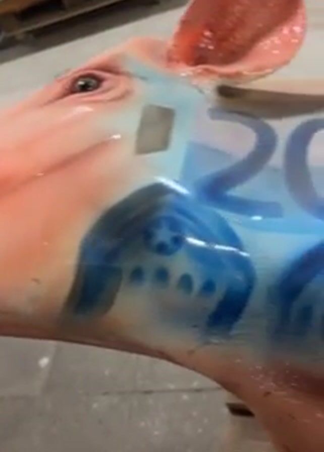 close-up view of a colorful pig statue. The pig is painted with various designs and currency symbols, including a 20 Euro note, a 50 Euro note, and an image of the European Union flag with yellow stars on a blue background. The surface of the pig is shiny and reflective. The background is blurry but appears to be a warehouse or storage area.