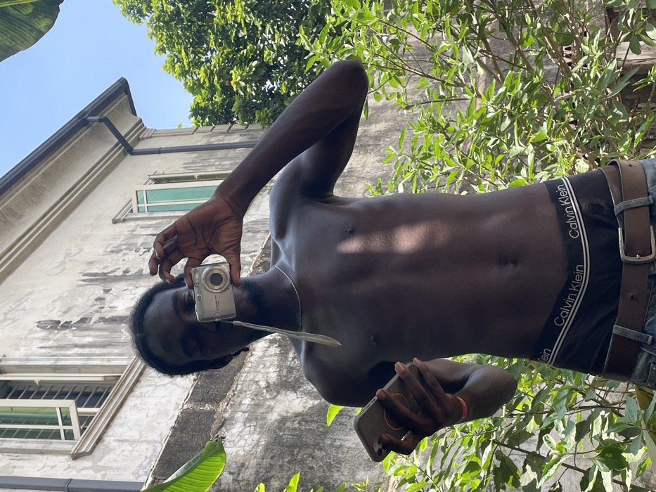 An adult male with dark skin and dark, loosely styled hair is depicted outdoors in a sunlit residential area of Lagos, Nigeria. He stands shirtless, wearing black Calvin Klein boxer briefs and blue jeans secured with a brown leather belt. A thin silver chain is visible around his neck, and a reddish band adorns his left wrist. The individual holds a silver-colored compact digital camera, branded "Olympus," in his raised right hand, positioning it directly in front of his face, obscuring his eyes and nose. A gray strap hangs from the camera. In his left hand, held lower, is a dark-colored smartphone encased in a gray cover with a circular magnetic accessory visible on its back. The background features a weathered, light-colored two-story building with a textured facade and architectural detailing, including a visible gutter system. An open window with white frames is on the upper left, and a closed window with blue-tinted glass is on the right. Dense green foliage, consisting of shrubs and broad leaves, frames the subject on both sides. A clear blue sky is visible in the upper right portion of the frame.