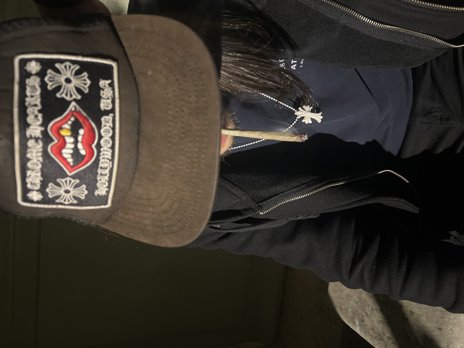 A close-up, low-light image depicts an individual in an unspecified outdoor or dimly lit indoor location within the city of Paris, France. The person's head is largely obscured by a dark brown trucker cap, which features a prominent rectangular patch. The patch is black with white lettering, reading "CHROME HEARTS" at the top and "HOLLYWOOD, USA" at the bottom, centered by a graphic of red lips with white teeth and a single gold tooth, flanked by two white Chrome Hearts cross motifs. A lit, hand-rolled cigarette, emitting smoke, is held between the person's lips. Long, dark hair is visible below the hat brim. The individual wears a black zippered jacket over a dark blue t-shirt and dark pants. A necklace with a white, cross-shaped pendant on a silver-colored beaded chain is visible around the neck. The background is dark and indistinct, with a lighter, possibly concrete or stone, surface visible in the lower left.