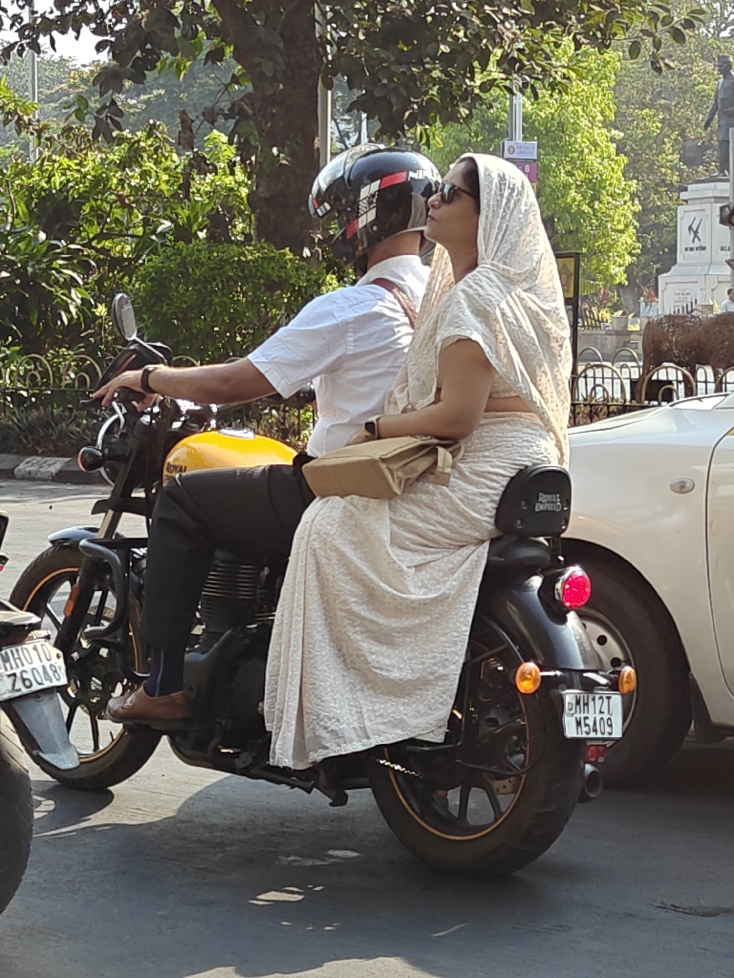 A man and a woman are riding a yellow Royal Enfield motorcycle on a street in Mumbai, India. The man is wearing a white shirt, dark pants, a helmet, and brown shoes. The woman is wearing a light-colored sari, sunglasses, and carrying a tan purse. The motorcycle has license plates reading "MH12T M5409" and "MH01D Z6048". A white car is visible to the right of the motorcycle. In the background, there are trees and a monument or statue, indicating an urban park or civic area typical of Mumbai. The lighting suggests it is daytime.