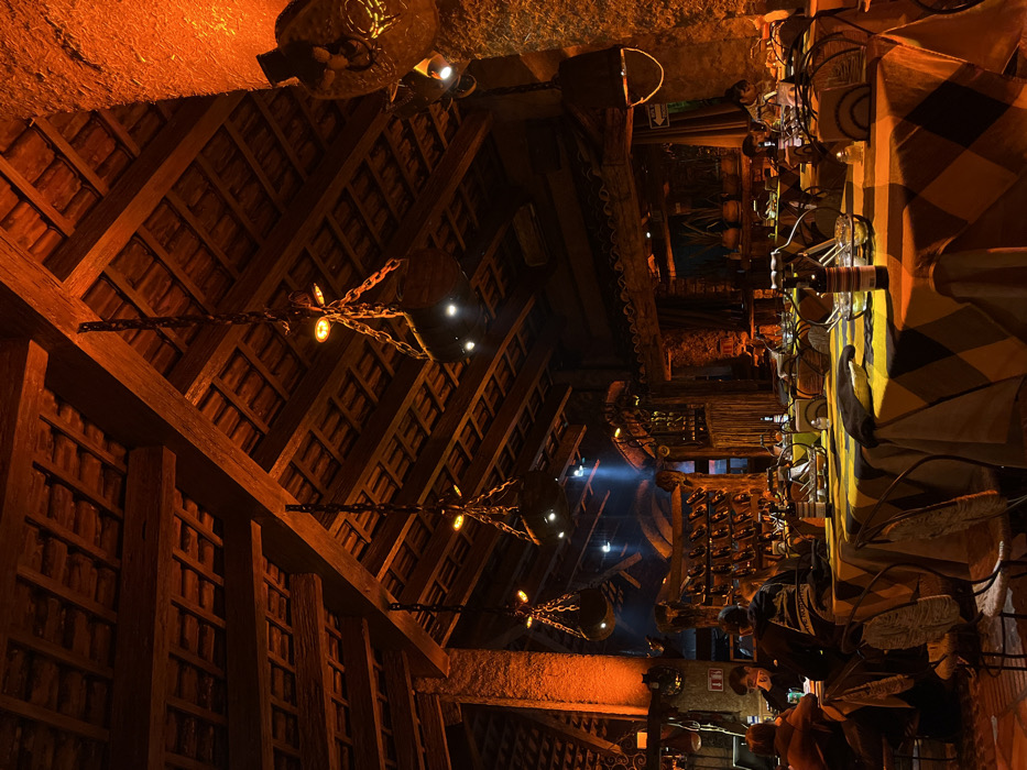 The image depicts the interior of a dimly lit, rustic-looking restaurant. Ornate wooden beams form the ceiling structure, adorned with hanging chain lights. Tables with patterned tablecloths are set with glasses and plates. A display of wine bottles lines the wall. Patrons are seated at the tables, adding a sense of activity to the warm, dimly illuminated space.